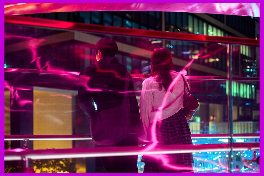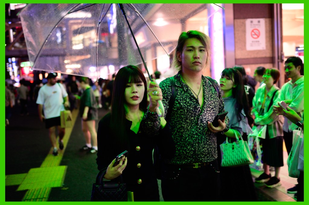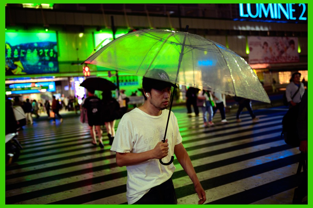 The commonality of these two night scenes goes beyond just the green colors. The transparent umbrellas featured in both scenes are quintessential Tokyo on a rainy night. These pair seamlessly.