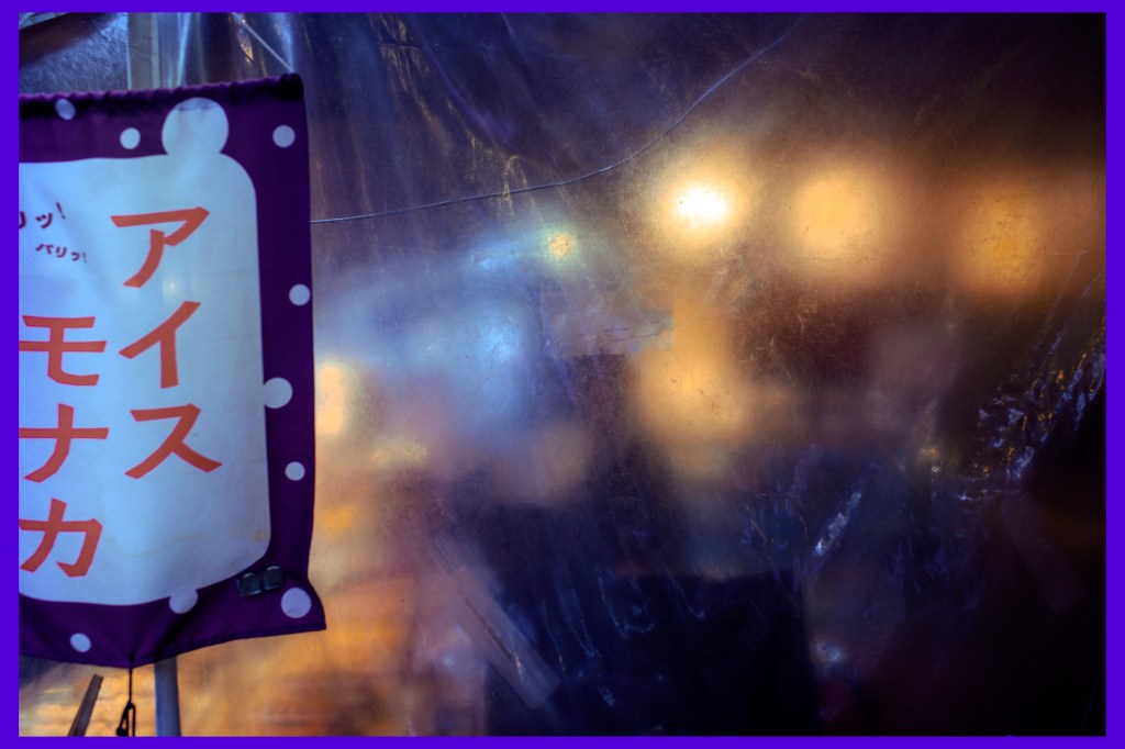 These two are more abstract in nature. The first one is shot through some hazy glass into a kitchen in Shinjuku. The second one has a swirly color palette created by a thick wrap of plastic around an outdoor seating area.
