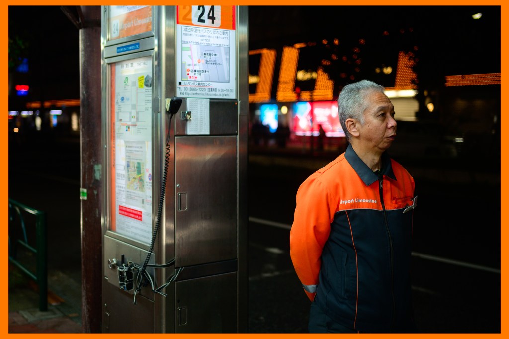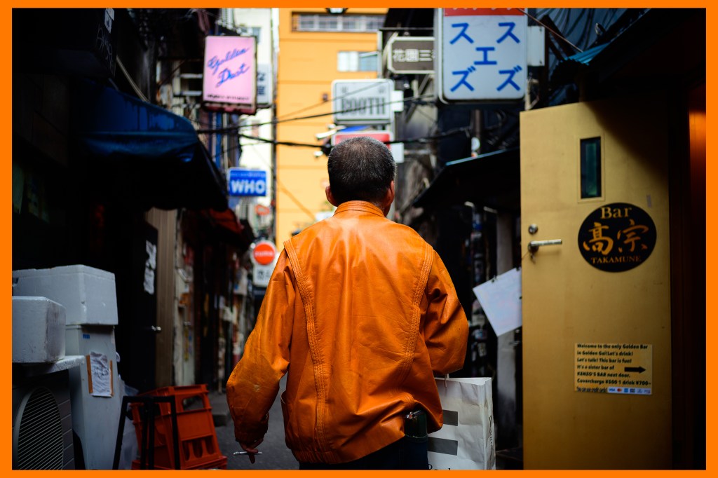 Orange is nuanced because a lot of scenes have warm hues but lack a specific orange pop. These two images feature tangerine-toned clothing. The first photo was taken during the quiet daytime hours in Golden Gai. By night, these dense alleyways become much busier due to the 200+ bars located there. The second photo balances an orange jacket with the orange bokeh in the background.