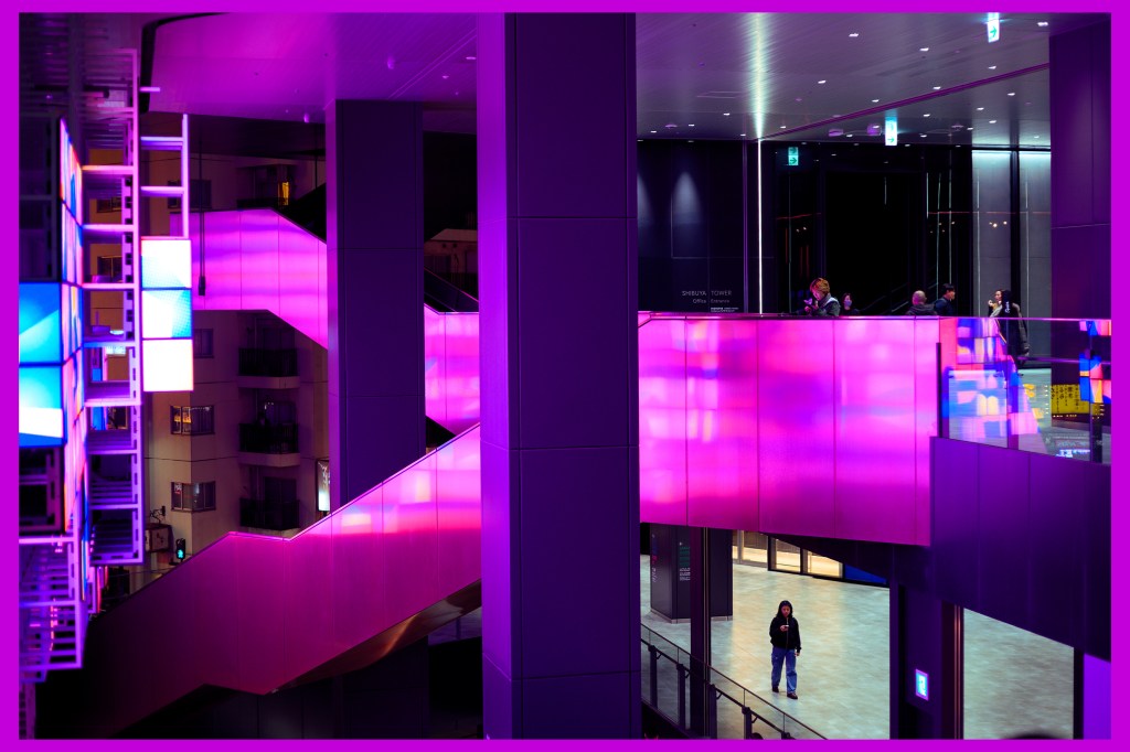 These were taken on the same night in Shibuya. This hyper-modern area near Shibuya Station features all the cyberpunk colors and architecture one could want. The vivid violets dominate these frames.
